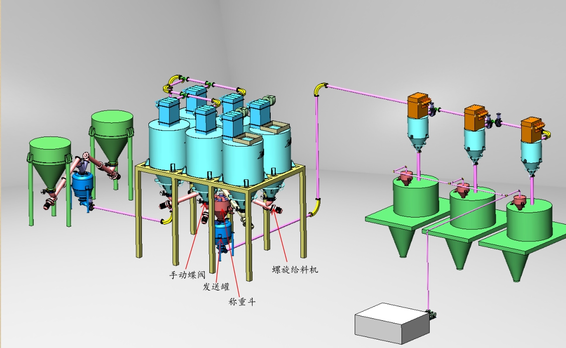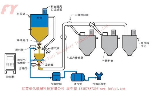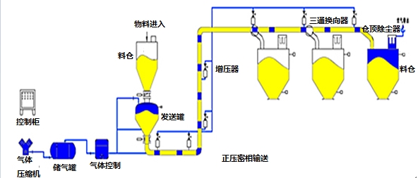 In the feed process, through the bell valve, double butterfly valve or expansion butterfly valve through the gravity of the material to the delivery tank, the replacement of air through the exhaust valve to make it easier to feed. Once the sending tank fill (or weighing display material to realize the 80% layer volume), the intake valve and the exhaust valve is automatically closed and sealed, and then sent by a high-pressure gas tank, the nozzle flow at the top of the gradually increased, the gas mixture within the tank and adding materials to automatically open the exhaust valve when the tank pressure reaches the set value, the flow state in pipeline the material in the pressurized tank and pipeline emptying until sending. When the pressure in the delivery tank drops to zero, the air supply valve closes, while the remaining gas is discharged from the delivery tank and the delivery line.