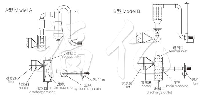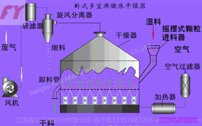 The bulk solid material by the feeder into the drier of fluidized bed, the filtered clean air is heated and is sent into the bottom of the fluidized bed by the blower and is contacted with the solid material by the distributing plate. Formation of fluidization, the heat and mass exchange of gas and solid. After drying, the material is discharged from the discharge port, and the exhaust gas is discharged from the top of the boiling bed. After the cyclone dust collector and the bag dust collector are recovered, the solid powder is discharged.