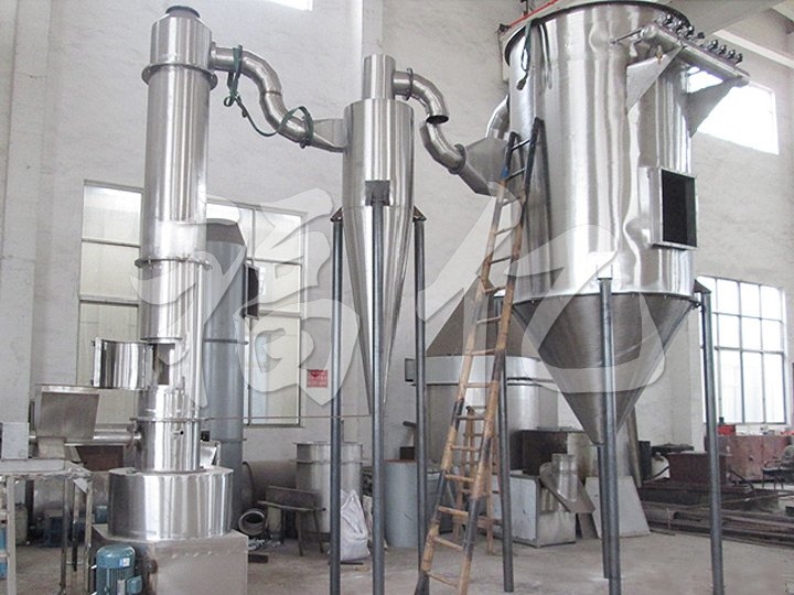 4. Due to the high speed of gas at circle inside the drying chamber and the staying time of raw material is short, high efficiency and quick speed can be realized