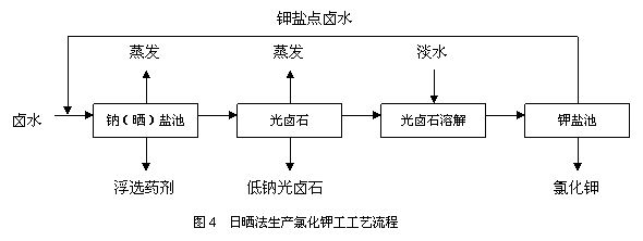 目前青海盐湖股份已建成日晒法5 000t/a的氯化钾生产车间,工艺流程见图4。抽取卤水在钠(晒) 盐池蒸发析出氯化钠,卤水浓缩至光卤石饱和点时,排入光卤石池继续蒸发析出光卤石,排去老卤。然后加人淡水溶解,排人钾盐池,进行日晒蒸发。氯化钠首先在钾盐池析出,当钾盐池卤水浓缩至氯化钠饱和时,此时的卤水称为钾盐点卤水,返回到钠盐池,进行循环利用。该工艺不需加入药剂,但是产率低,受气候条件影响大。