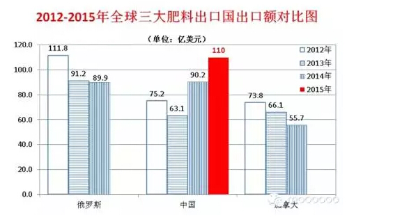 对比往年全球化肥出口数据,2015年度中国化肥出口量和出口额已经远超加拿大,并有望首次超过俄罗斯,成为全球第一大肥料出口国。根据联合国国际贸易统计数据,2014年度全球肥料(含氯化铵、硝酸钾、有机肥料及所有其他化肥)出口实物量排在前三名的国家是俄罗斯3090万吨、中国2979万吨、加拿大1958万吨,出口额分别为89.9亿美元、90.2亿美元和55.7亿美元。