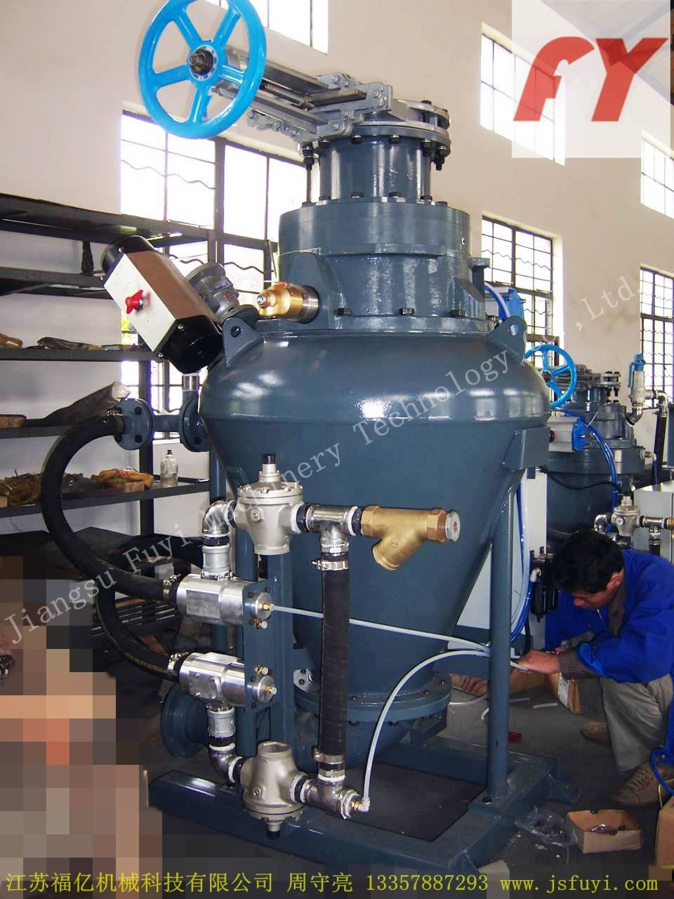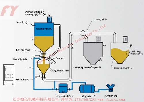 Khi nhập nguyên liệu vào , vật liệu đi qua van chuông , van bướm đôi hoặc van bướm kiểu bơm phồng dưới tác dụng của trọng lực sẽ được đưa vào thùng truyền phát , Những không khí được thay thế sẽ được van xả đưa ra ngoài , khiến cho việc nhập nguyên liệu dễ dàng hơn . Khi mà thùng truyền phát đã đầy ( khi dung tích của thùng đã đạt đến 80% và được hiển thị thông qua các thiết bị đo lường và cân nặng vật liệu ) , van nguyên liệu và van xả sẽ lập tức tự động đóng và niêm phong lại , sau đó thông qua van nhập khí hướng đến đỉnh đầu của thùng truyền phát để thêm khí nén vào , lượng khí nén được nạp vào sẽ được trộn chung với vật liệu , khi áp lực bên trong thùng đạt đến giá trị thiết lập , phần dưới của van xuất nguyên liệu sẽ được tự động mở ra , lúc này nó sẽ đặt áp lực lên toàn bộ đường truyền , sau đó vật liệu sẽ được vận chuyển theo kiểu pit tông , cho đến khi lọc khí vật liệu . Khi áp lực của thùng truyền phát giảm xuống thành không , bộ phận cung cấp khí nén sẽ đóng lại ngay lập tức , những lượng khí dư còn lại sẽ bị thải ra thùng truyền phát và ống dẫn