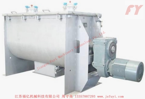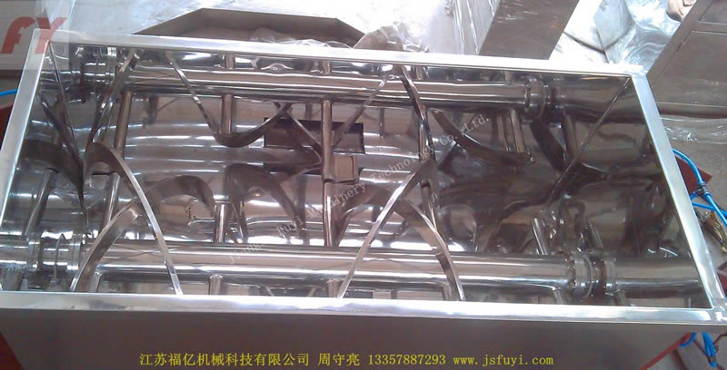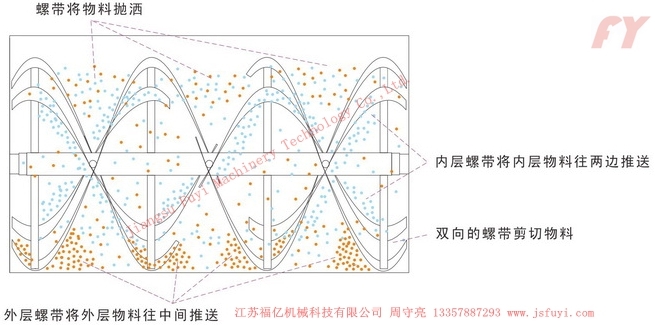 Dưới lực điều khiển trục máy khuấy và bên ngoài băng xoắn ốc, hình thức uốn quanh phối hợp phương hướng xoay chuyển đem vật liệu từ cả hai đầu kho hình chữ U thúc đẩy đến khu trung tâm, còn bên trong băng xoắn ốc đem vật liệu từ giữa thúc đẩy đến hai đầu, hình thành trộn đối lưu. Trung tâm phần đáy xi lanh nằm ngang của máy trộn mở cửa xuất vật liệu, cấu trúc quay cuộn của lớp bên ngoài băng xoắn ốc cũng phối hợp trục chính xoay chuyển phương hướng đẩy các vật liệu ở bức tường bên trong của xi lanh đến cửa xuất vật liệu trung tâm mà đi ra, đảm bảo các vật liệu trong xi lanh đi ra không góc chết.