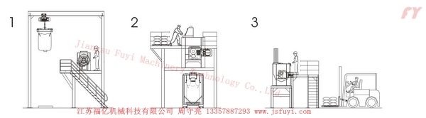 2:Dựng lên nền tảng đa tầng, công nhân tháo túi bỏ vật liệu vào, sau khi trộn và xuất vật liệu thì áp dụng máy đóng gói băng tấn;