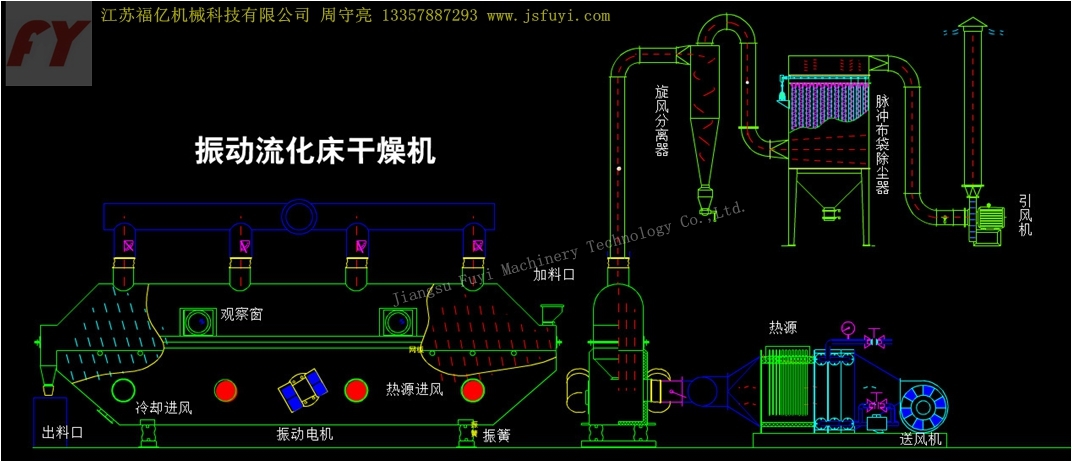 Máy sấy khô tầng sôi là do vật liệu từ cửa vật liệu vào đi vào trong máy, dưới tác dụng của lực rung động, vật liệu dọc theo mặt phẳng nước mà tầng vôi ném, liên tục vận động tiến về phía trước, sau khi khí nóng tiến lên phía trên xuyên qua tầng vôi và vật liệu ướt để trao đổi khí, sau khi không khí ẩm ướt qua máy tách gió lốc loại bỏ bụi do cửa thải gió thải ra. Áp dụng cho các việc sấy khô, làm lạnh vv các vật liệu dạng bột, dạng hạt trong các ngành nghề như công nghiệp hóa chất, chế thuốc, thực phẩm, thoát nước rau cải, lương thực, khoáng sản vv.